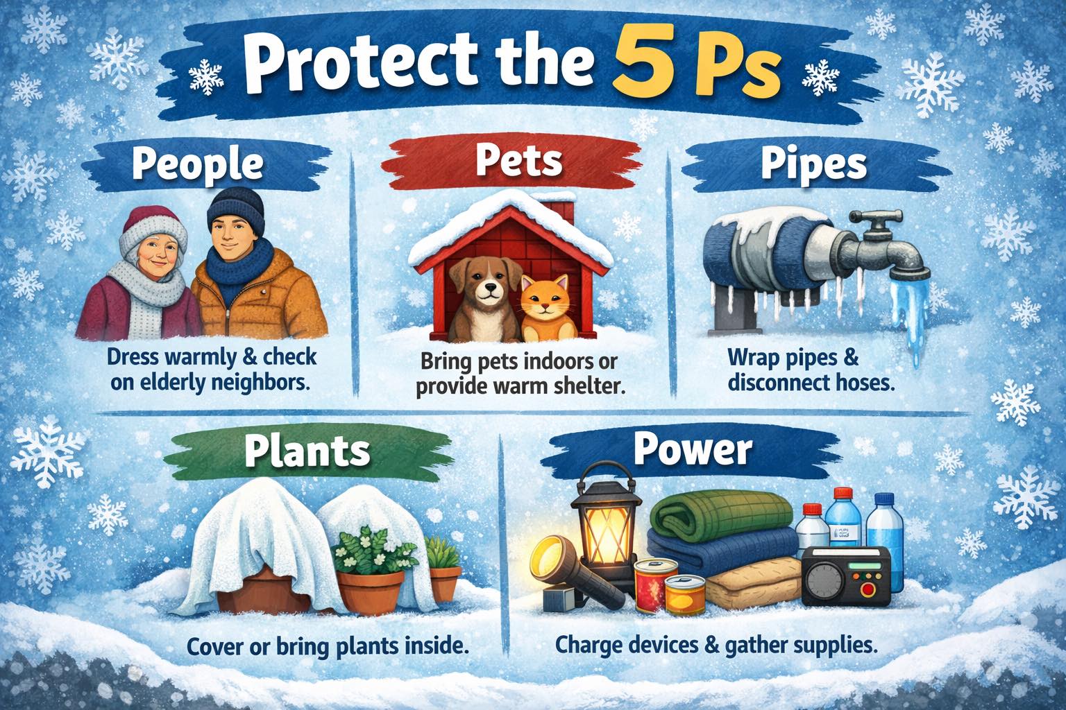 People – Dress in warm layers, limit time outdoors, and check on elderly neighbors or anyone who may need assistance.