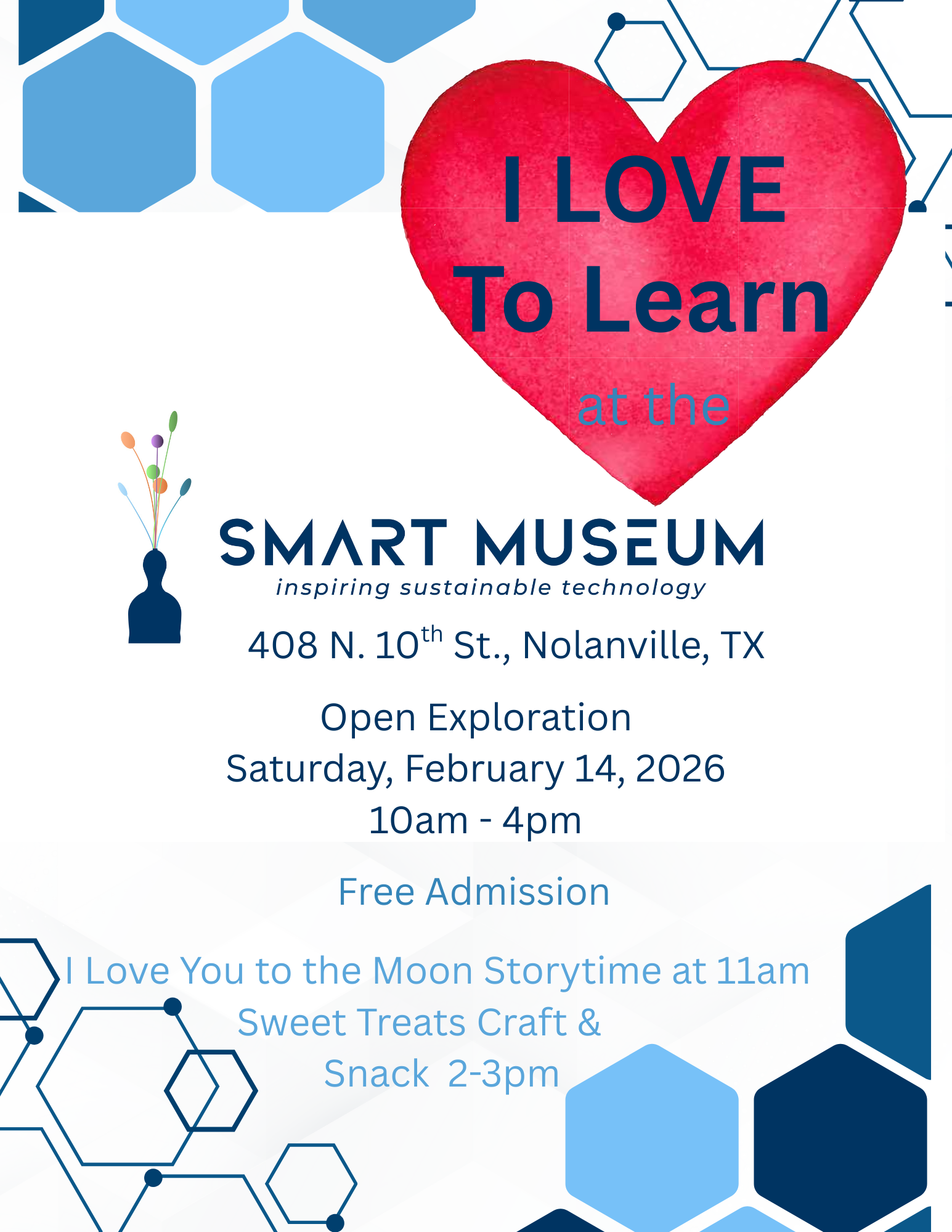 You asked—and we listened! Join us for a special Valentine’s Day opening at the Nolanville SMART Museum. For one day only, we’re opening our doors for Open Exploration—and yes, it’s FREE!