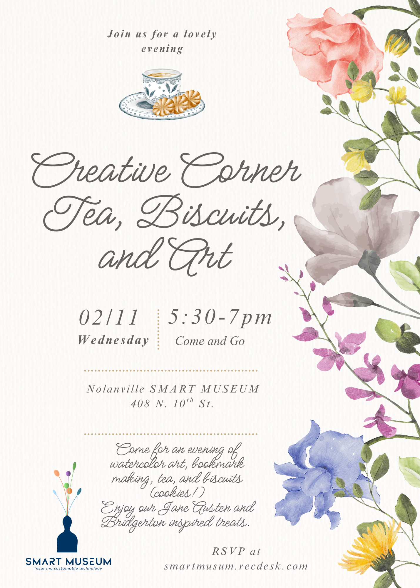 Please join us for a most delightful evening of refinement and creativity at Creative Corner: Tea, Biscuits, and Art. Guests are invited to partake in watercolor art and bookmark making while enjoying tea and sweet biscuits in charming company.